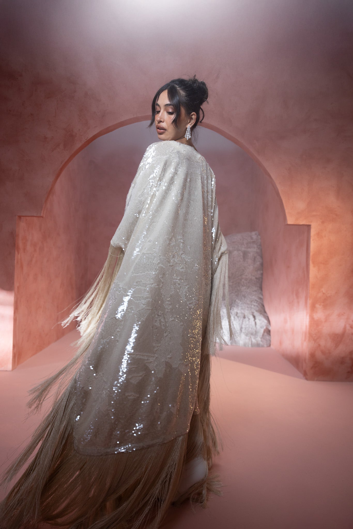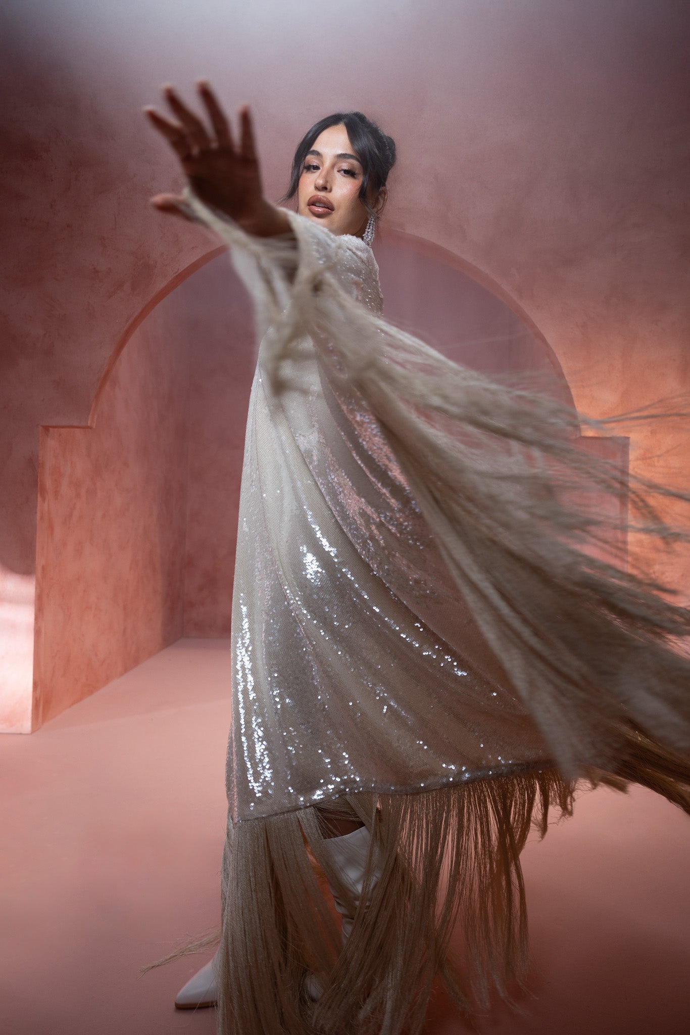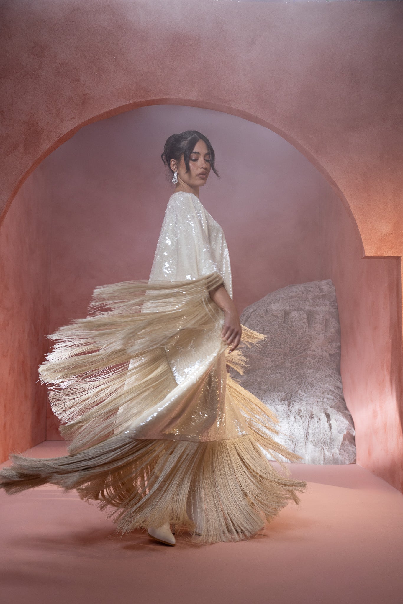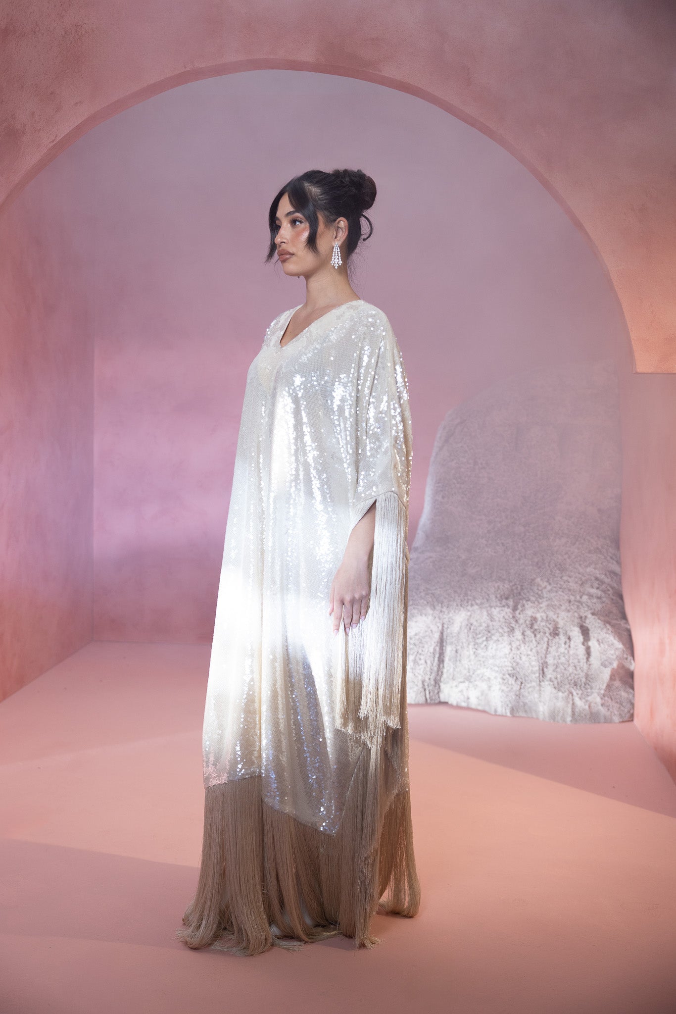 sequined crème hue, featuring an extra stylish fringe that adds a dynamic and fashionable flair. The shimmering fabric enhances its elegance, while the fringe detail offers a modern, textured touch.