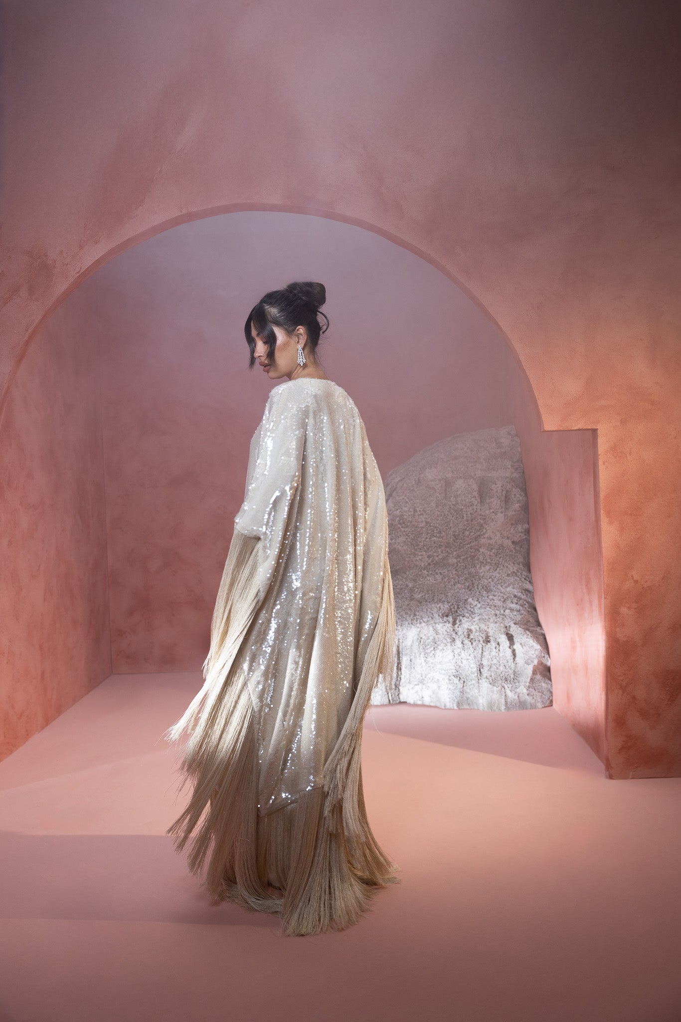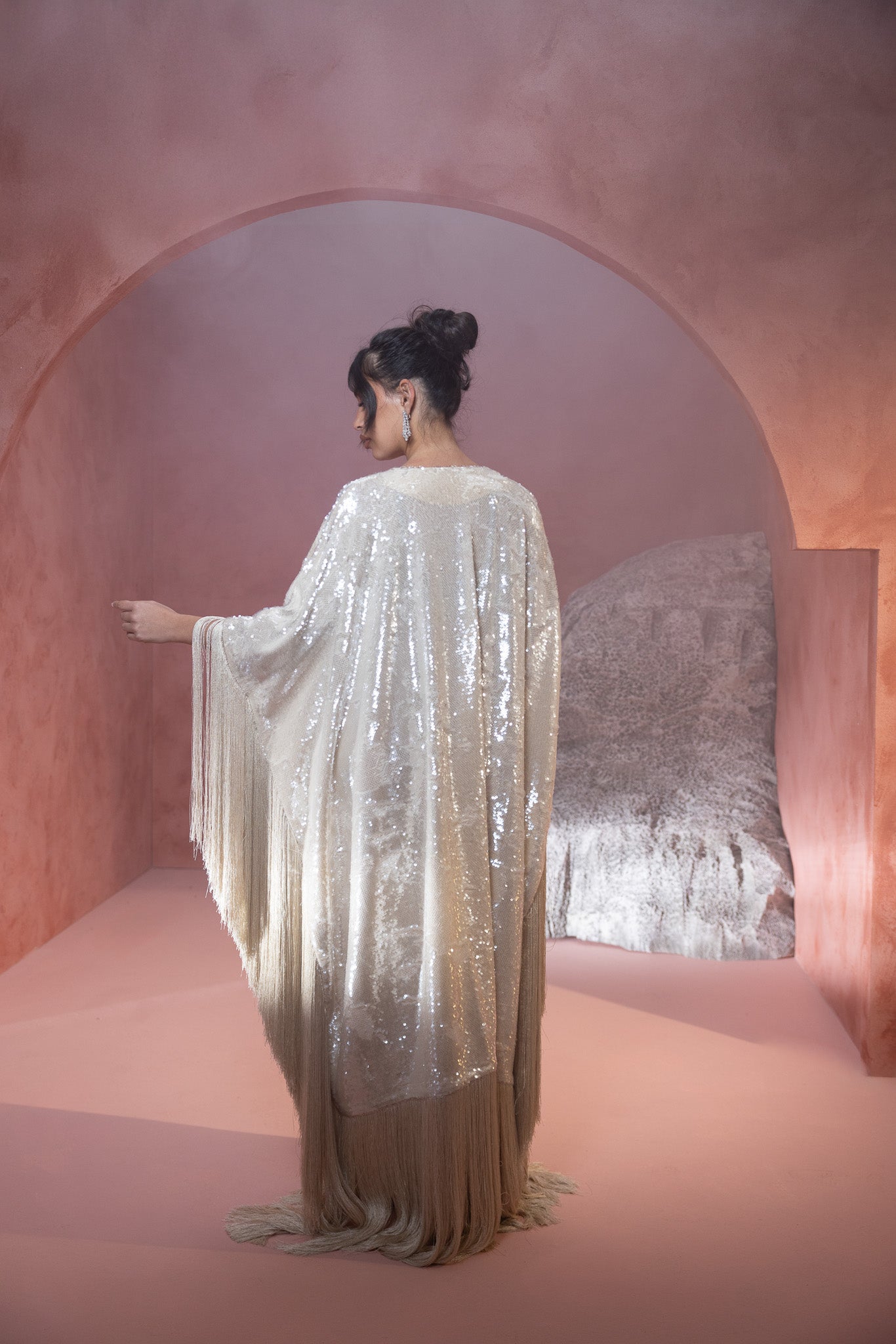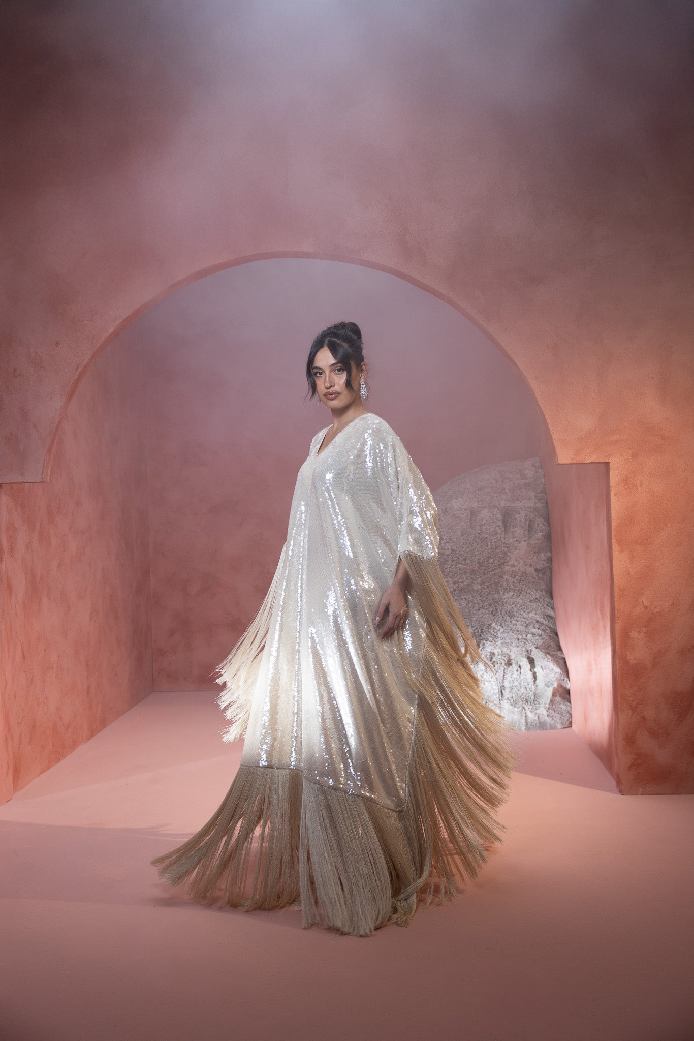 sequined crème hue, featuring an extra stylish fringe that adds a dynamic and fashionable flair. The shimmering fabric enhances its elegance, while the fringe detail offers a modern, textured touch.
