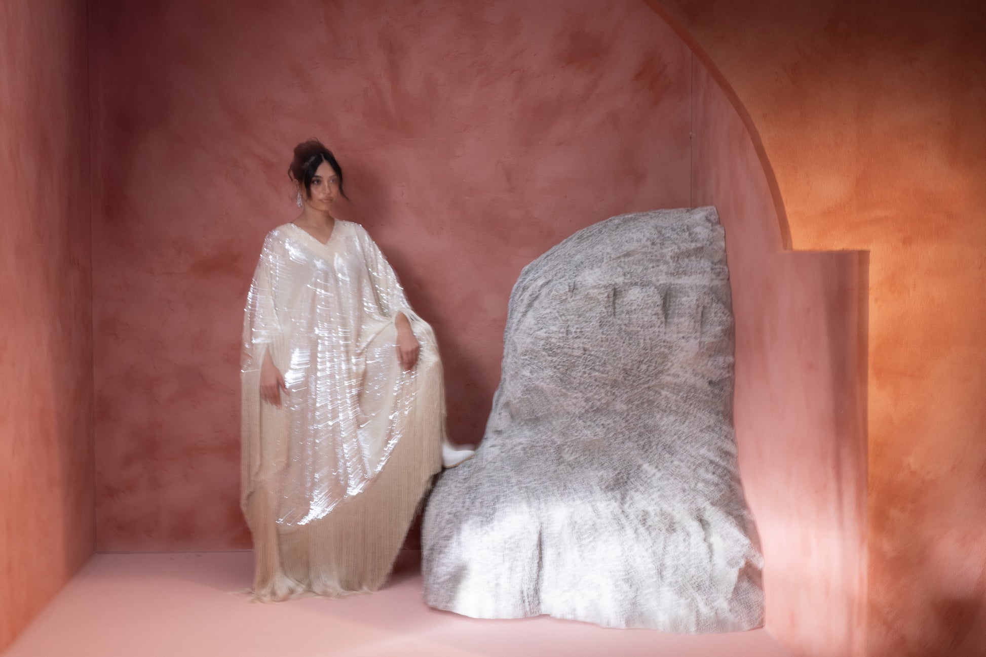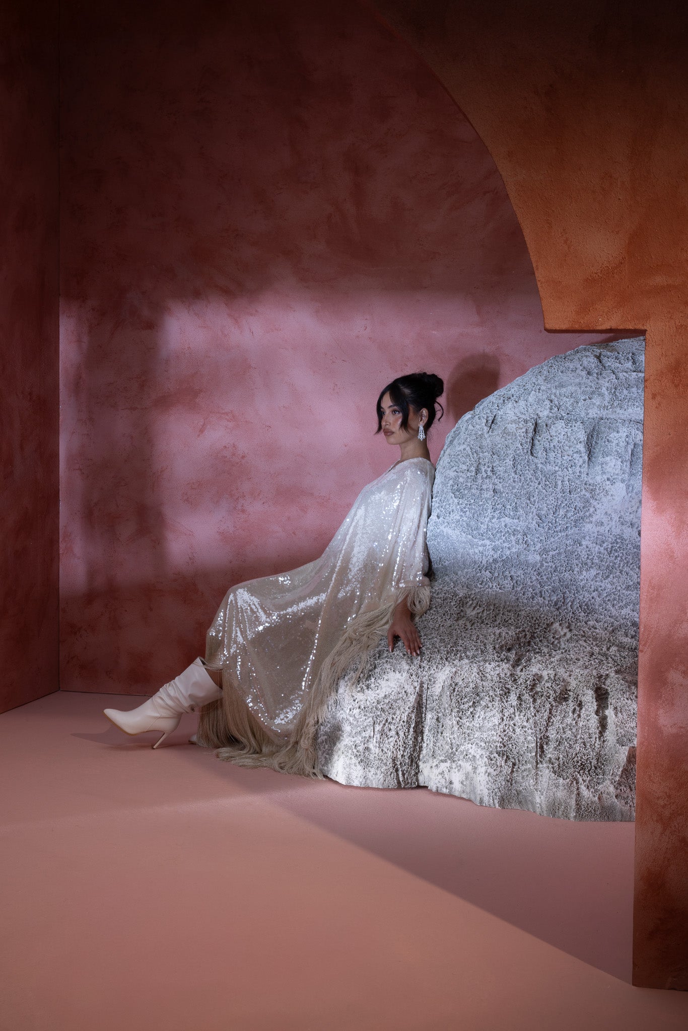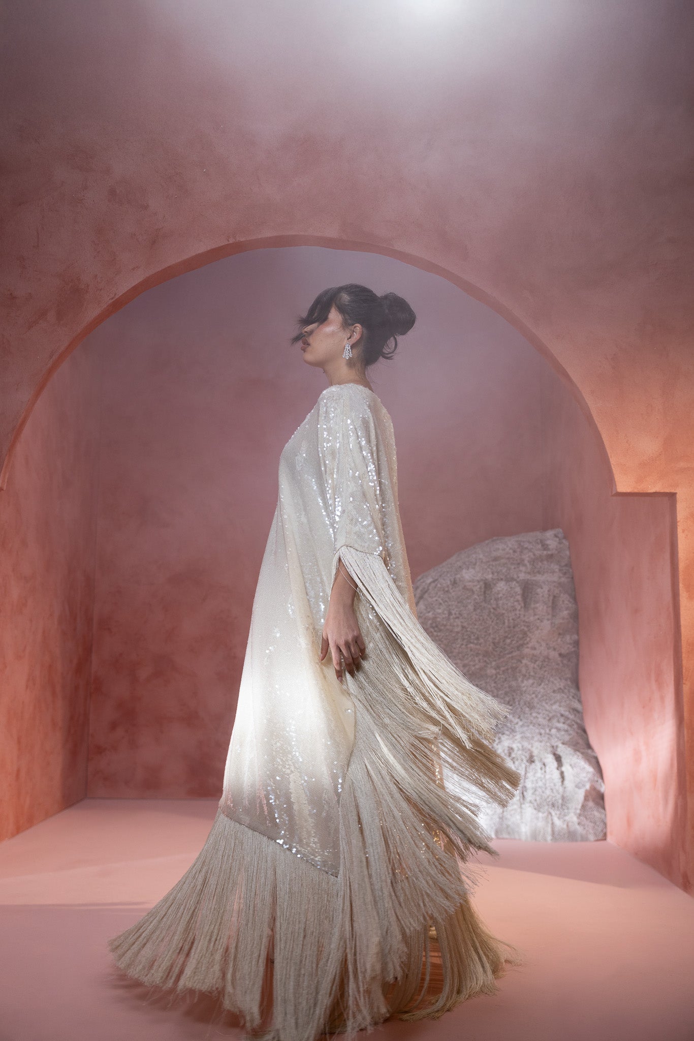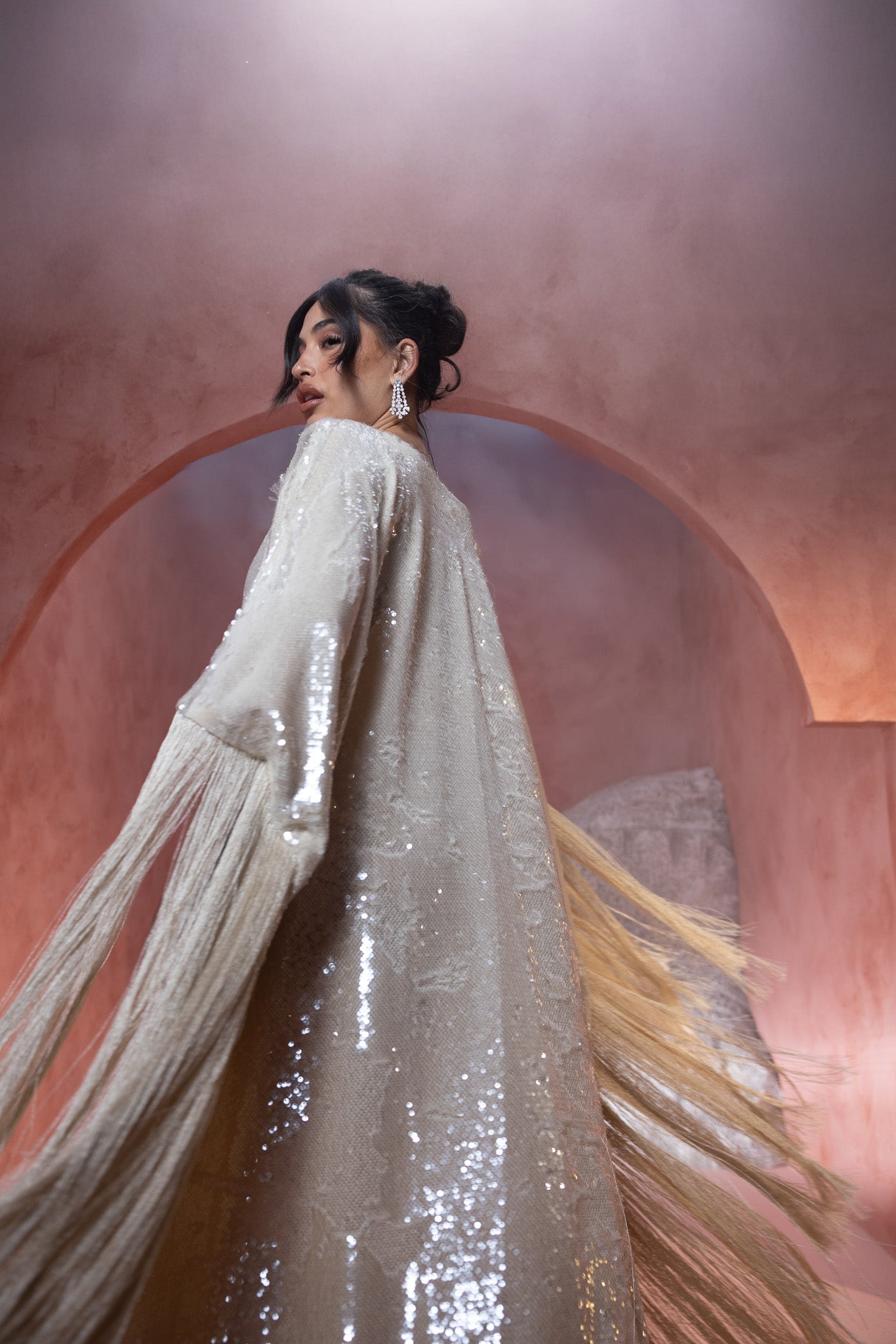 sequined crème hue, featuring an extra stylish fringe that adds a dynamic and fashionable flair. The shimmering fabric enhances its elegance, while the fringe detail offers a modern, textured touch.
