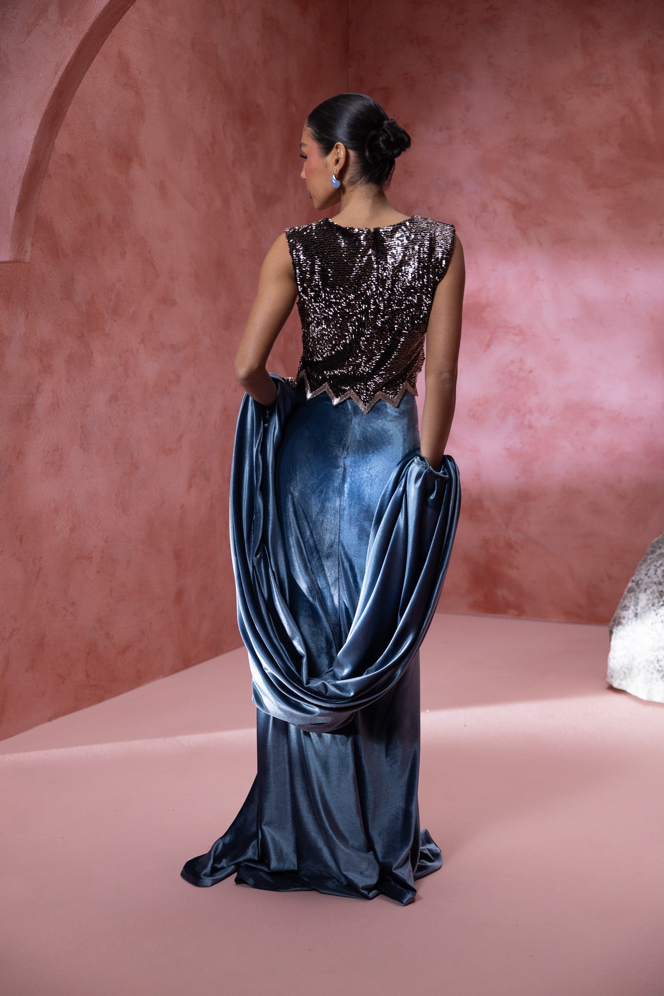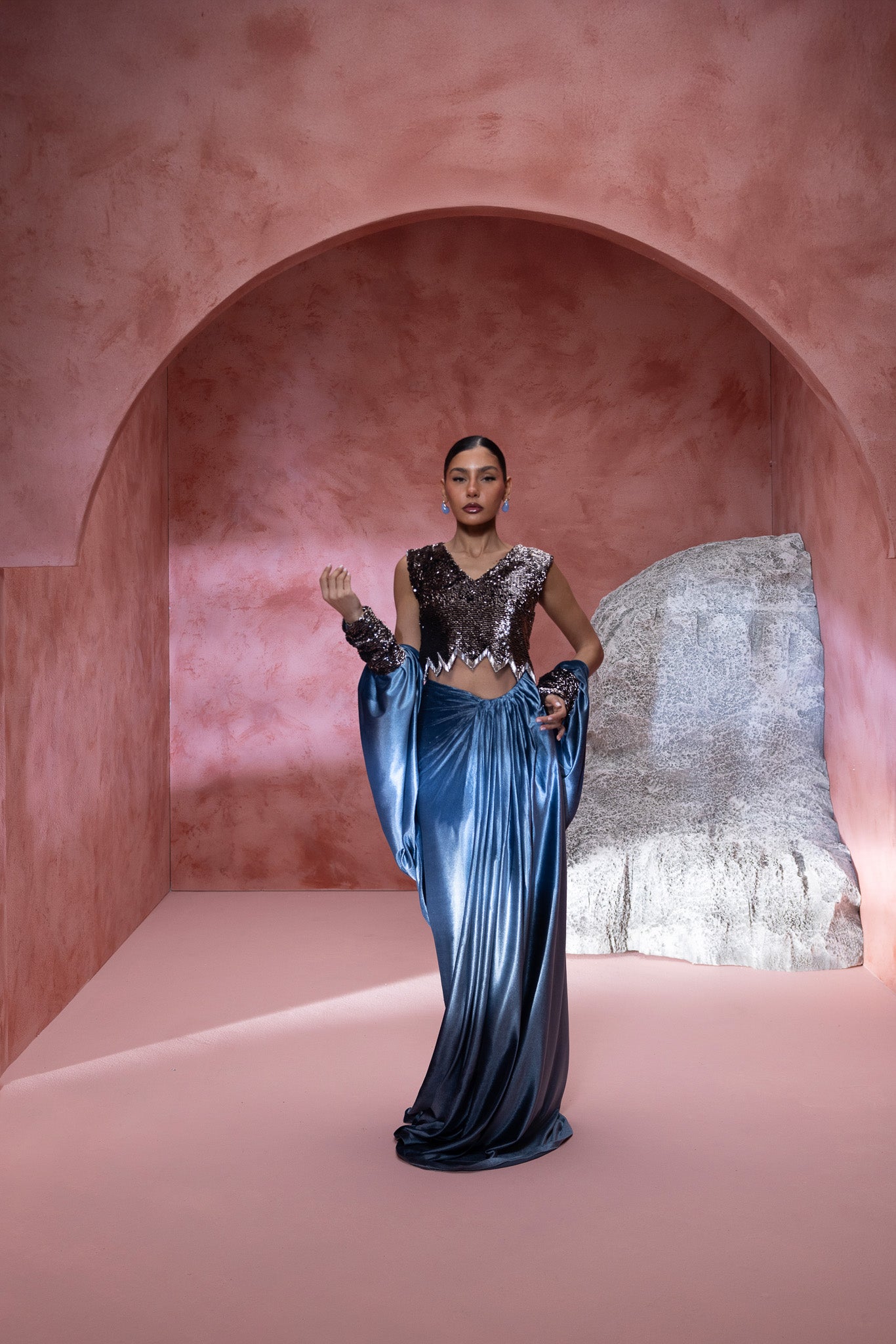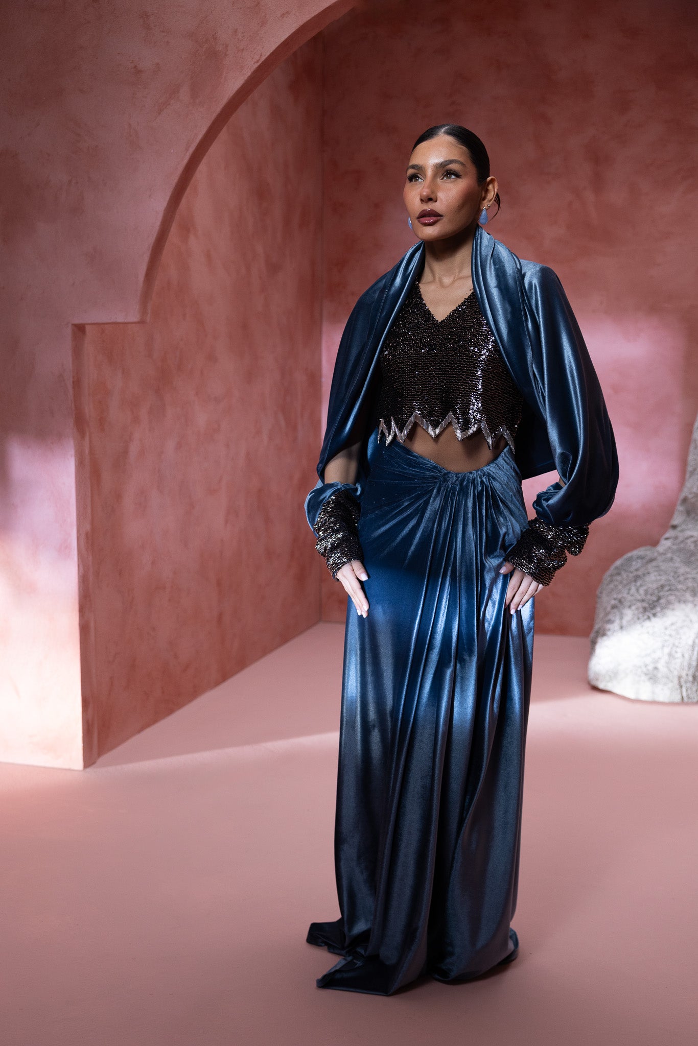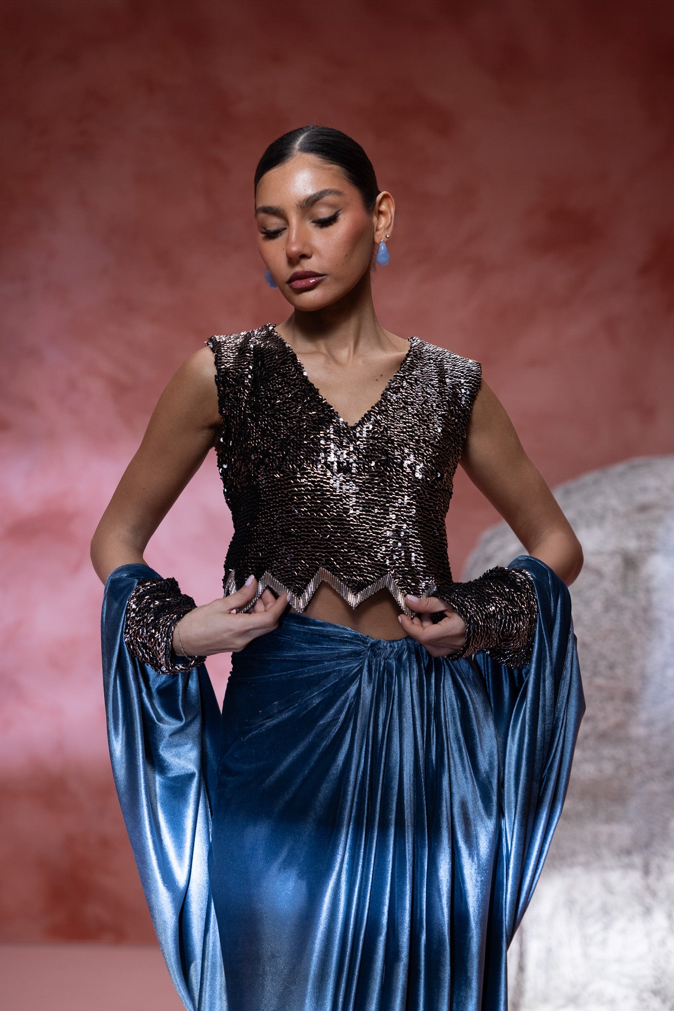 adorned in a stunning ensemble the top is a shimmering, intricately detailed design, elegantly paired with a luxurious blue velvet skirt that drapes gracefully to the floor. Complementing this is a flowing cape that adds an air of regal elegance. The billowing sleeves and textured details enhance , the composition highlights the harmonious blend of materials, offering a perfect fusion of modern fashion and classic charm. Ideal for those looking to make a bold yet refined statement.
