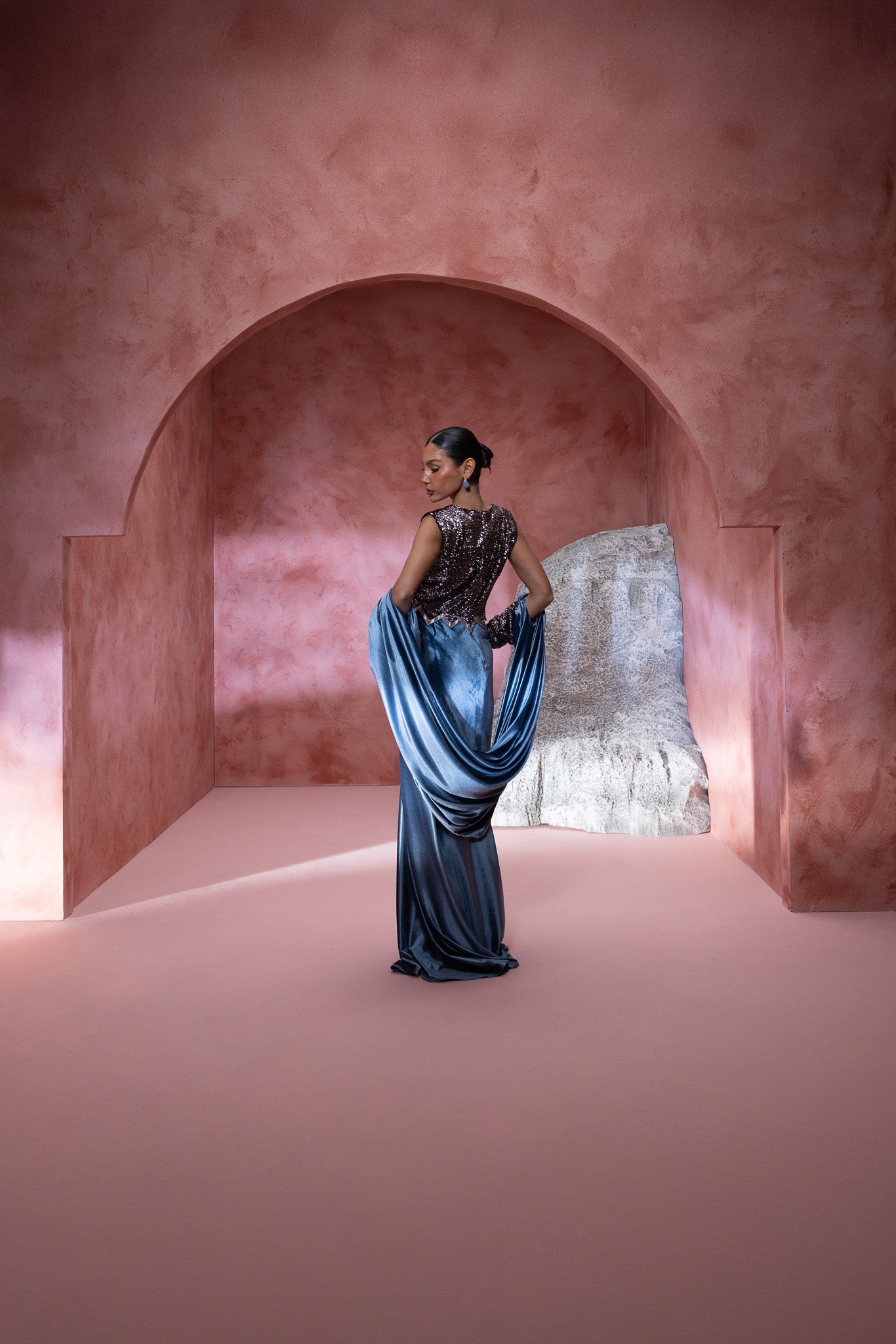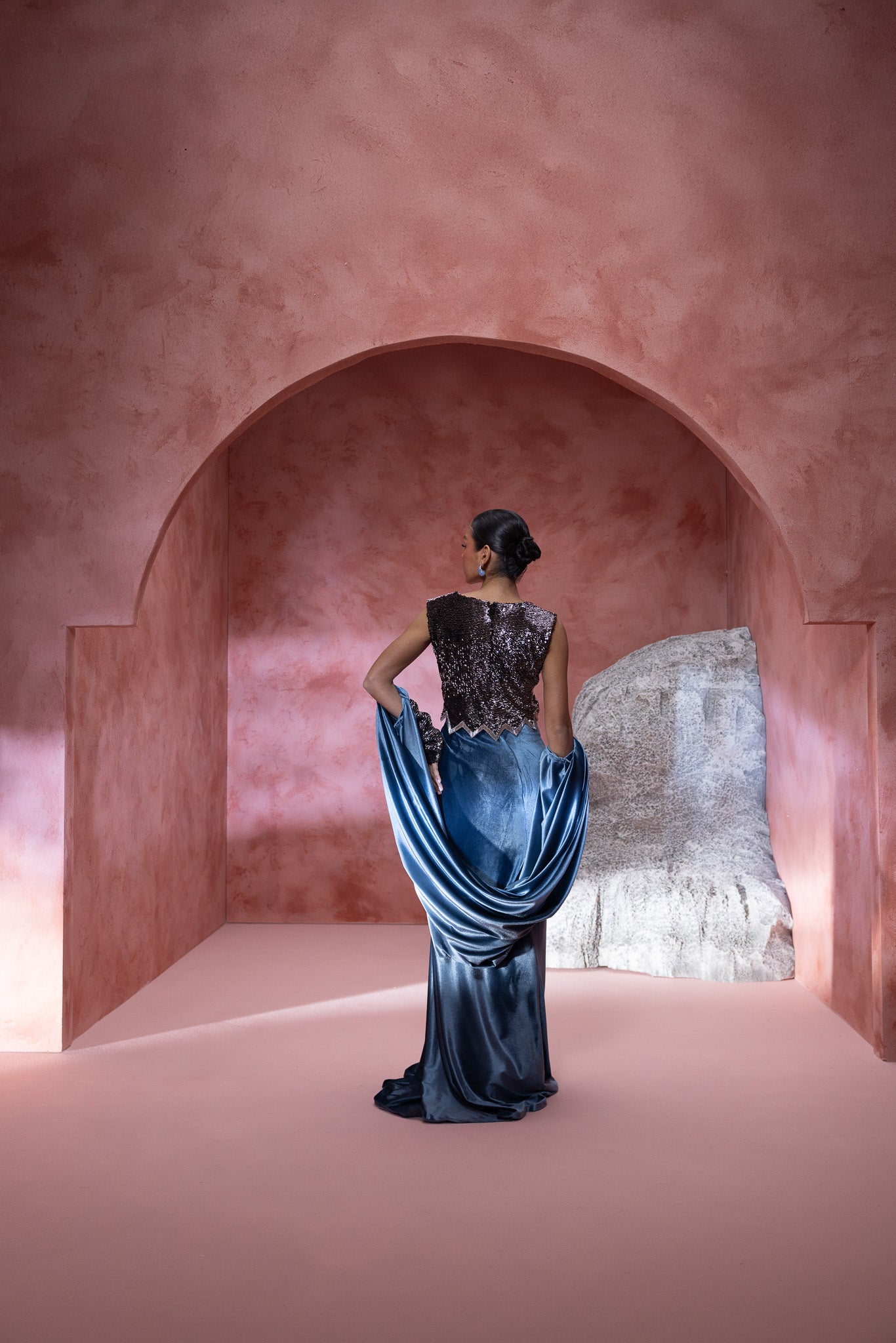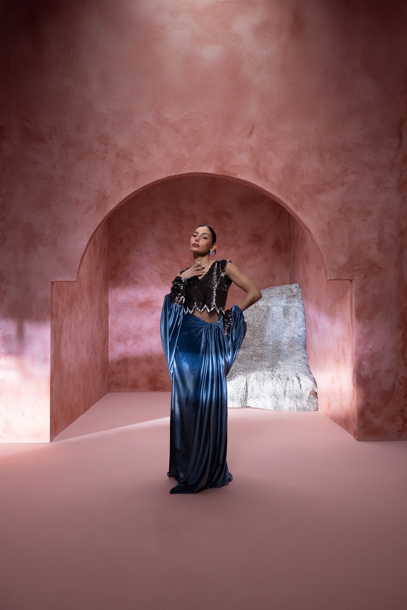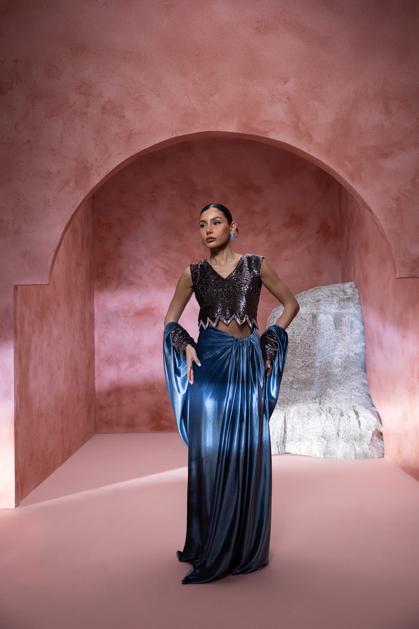 adorned in a stunning ensemble the top is a shimmering, intricately detailed design, elegantly paired with a luxurious blue velvet skirt that drapes gracefully to the floor. Complementing this is a flowing cape that adds an air of regal elegance. The billowing sleeves and textured details enhance , the composition highlights the harmonious blend of materials, offering a perfect fusion of modern fashion and classic charm. Ideal for those looking to make a bold yet refined statement.